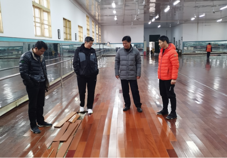 谭志刚一行对红湘校区、雨母校区体育馆、田径场、健美操房、乒乓球馆等依次进行了安全隐患全面排查。其中,针对雨母校区乒乓球馆漏水问题立即进行了处理,北校健美操房地板破损亟待处理。
